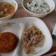 豚すき丼、ポテトコロッケ、辛子和え、ご飯、お茶