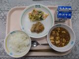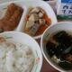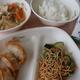 揚げ餃子、生揚炒菜、パリパリ中華サラダ、ご飯、牛乳