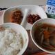 イカのチリソース、もやしとハムのピリ辛和え、春雨スープ、ご飯、牛乳