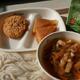 きつねうどん、かぼちゃコロッケ、ゆずみそ田楽、地粉うどん、お茶