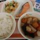鮭の塩焼き、おでん、白菜のゆず漬物、ご飯、牛乳