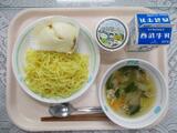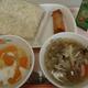 イカの竜田揚げ、小松菜のナムル、春雨スープ、ご飯、牛乳