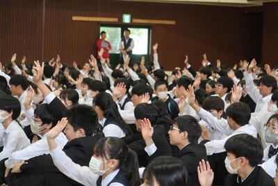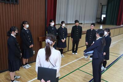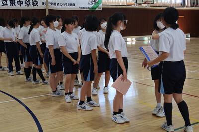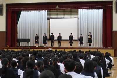 今朝は全校生徒が体育館に集まり、生徒朝会が行われました。