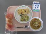 イカのチリソース、もやしとハムのピリ辛和え、春雨スープ、ご飯、牛乳