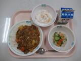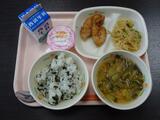 鶏肉の薬味ソース、切干大根のはりはり漬け、小松菜とじゃが芋の味噌汁、わかめご飯、牛乳、お祝いいちごゼリー