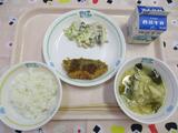 鰆の甘辛揚げ、きんぴらごぼう、かき玉汁、たけのこご飯、お祝いいちごクレープ、牛乳