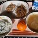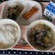 イカの竜田揚げ、小松菜のナムル、春雨スープ、ご飯、牛乳