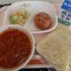 ミートソース、小さい砂糖揚げパン、コールスローサラダ、スパゲッティ、牛乳