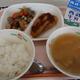 チキンのこんがり焼き、キャベツとコーンのサラダ、ビーンズミネストローネ、ガーリックライス